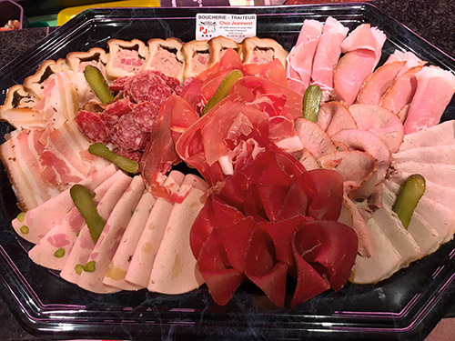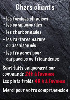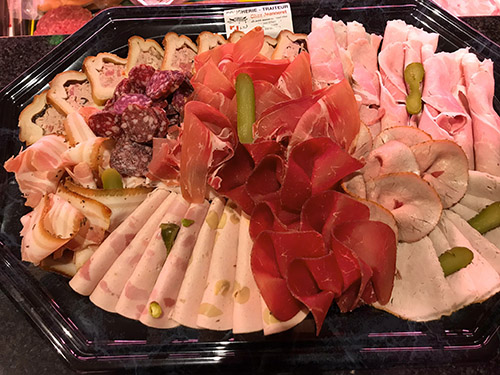 Jambon, charcuterie, rôti cuit, roastbeef, terrine, pâté en croûte, lard aux herbes, saucisses sèches, viande séchée, jambon cru. En apéro : Frs 7,50 / En apéro-dinatoire : Frs 9,50 / Plat principal : Frs 12,50